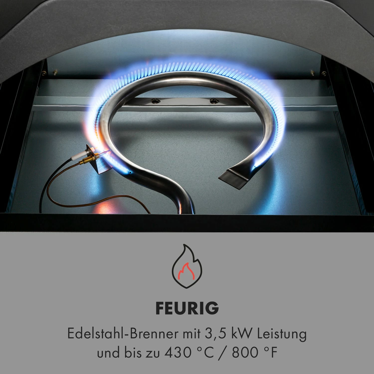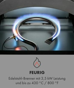 - Feurig: Edelstahl-Brenner mit 3,5 kW Leistung und bis zu 430 °C / 800 °F