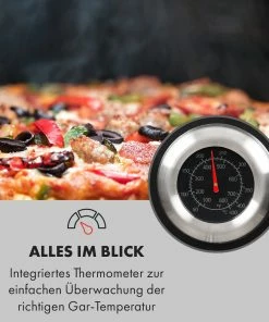 - Viel Platz: zwei Edelstahl-Roste und ein Pizza-Stein aus Schamotte warten auf hungrige Grill- und Pizza-Freunde