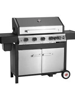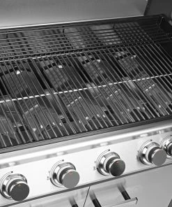 - Gasgrillwagen mit 5 stufenlos einstellbaren Brennern (18 kW) für unterschiedliche Garzonen und im Regler integrierter Piezo-Zündung für heiße Temperaturen bis zu 300 °C