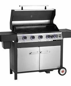 - Gasgrillwagen mit 5 stufenlos einstellbaren Brennern (18 kW) für unterschiedliche Garzonen und im Regler integrierter Piezo-Zündung für heiße Temperaturen bis zu 300 °C