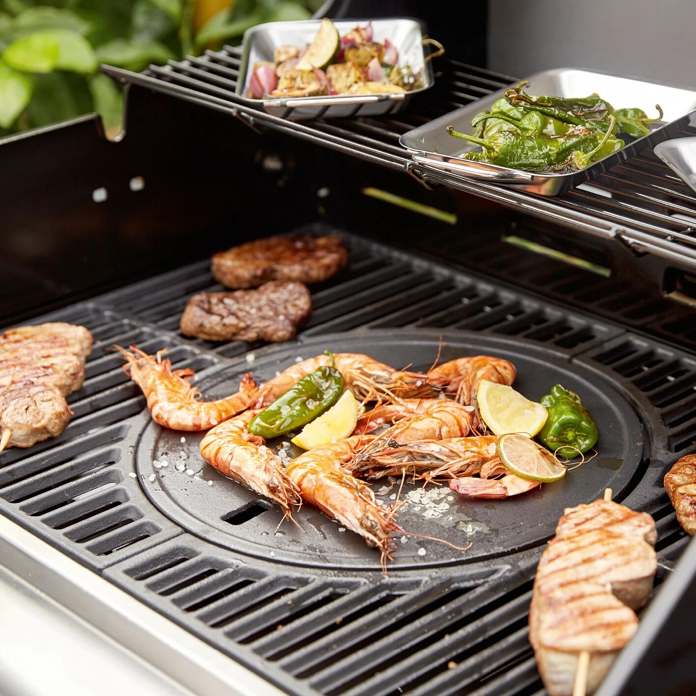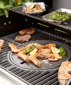Die Grillplatte AG-IV-100 von LANDMANN ist Teil des LANDMANN Modulus-Systems mit auswechselbarem Basiseinsatz in der Mitte. Diesen nimmst du mit dem Grillrostheber einfach heraus und setzt stattdessen die Grillplatte aus emailliertem Gusseisen ein. Sie ist ideal für kleinteiliges Grillgut geeignet, das dir nun nicht mehr durch den Grillrost fallen kann. Du kannst sie beidseitig verwenden und z. B. auf der gerippten Seite Shrimps grillen, während sich auf der flachen Seite Spiegeleier zubereiten lassen. Gusseisen ist schwer und robust. Die Grillplatte AG-IV-100 von LANDMANN hat außerdem den Vorteil, dass sie aufgrund des Materials die Hitze besser speichern und gleichmäßig auf der gesamten Grillfläche abgeben kann.