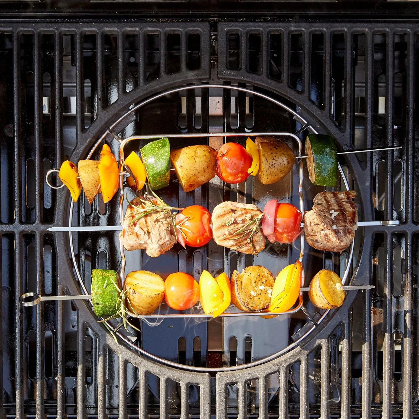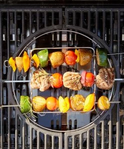 Mit dem Landmann Modulus Grillspieß-Set können Sie gleich 5 Spieße auf einmal sicher auf Ihrem Gasgrill zubereiten. Die clevere Lösung lässt sich unkompliziert in den Grillrost einsetzen und hält die Spieße sicher über der Flamme. Da die Zutaten vom Spieß keinen direkten Kontakt zum Rost haben und sich um 360° drehen lassen, garen sie gleichmäßig und ohne Anbrennen. Die fünf Edelstahl-Spieße sind ca. 36 cm lang und bieten somit ausreichend Platz für leckere Schaschlik- oder knackige Gemüsespieße. Das Landmann Modulus Grillspieß-Set passt ideal für Holz- und Gasgrills.