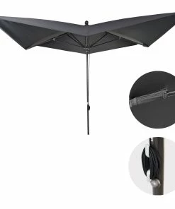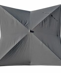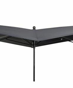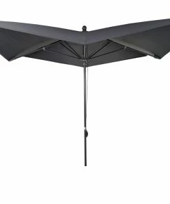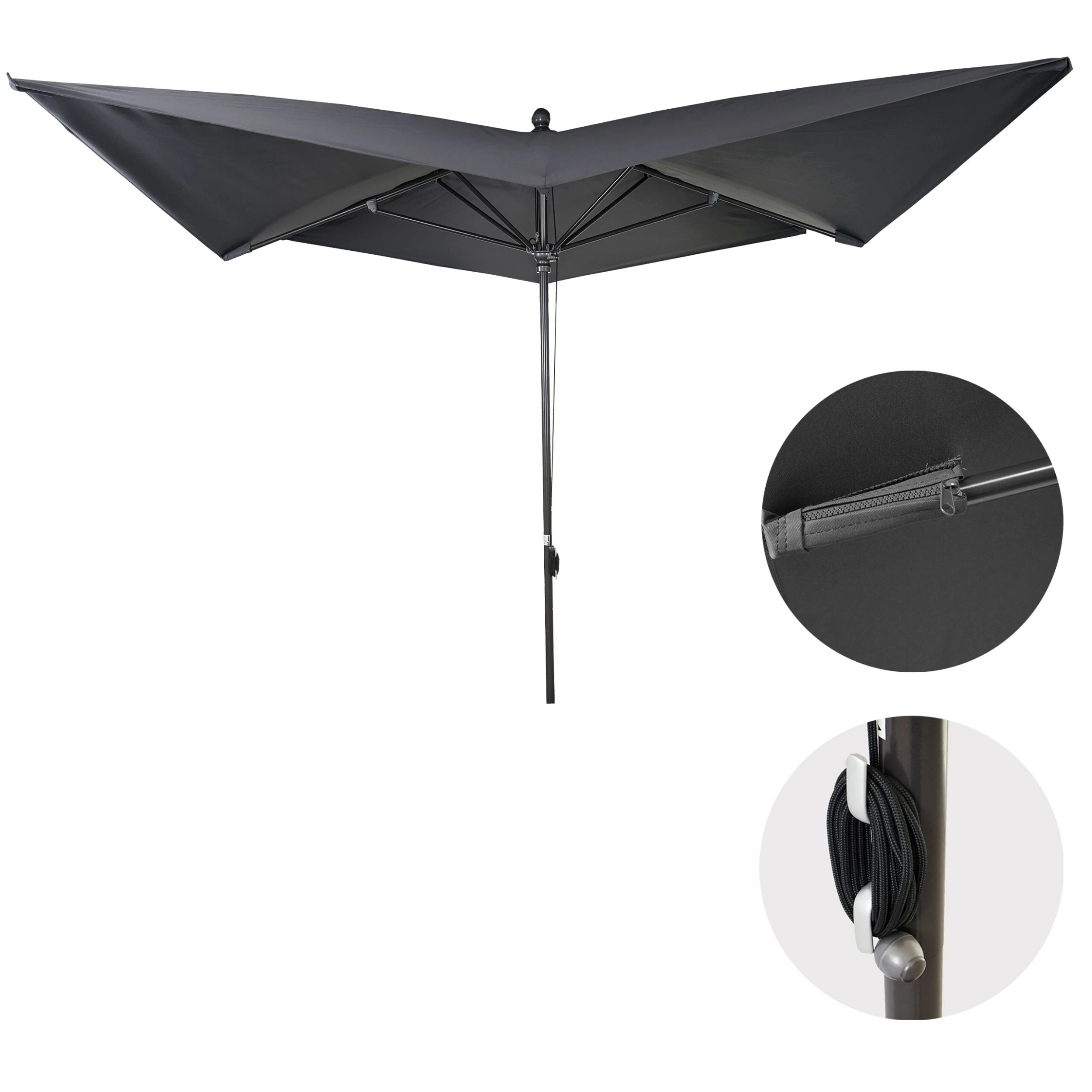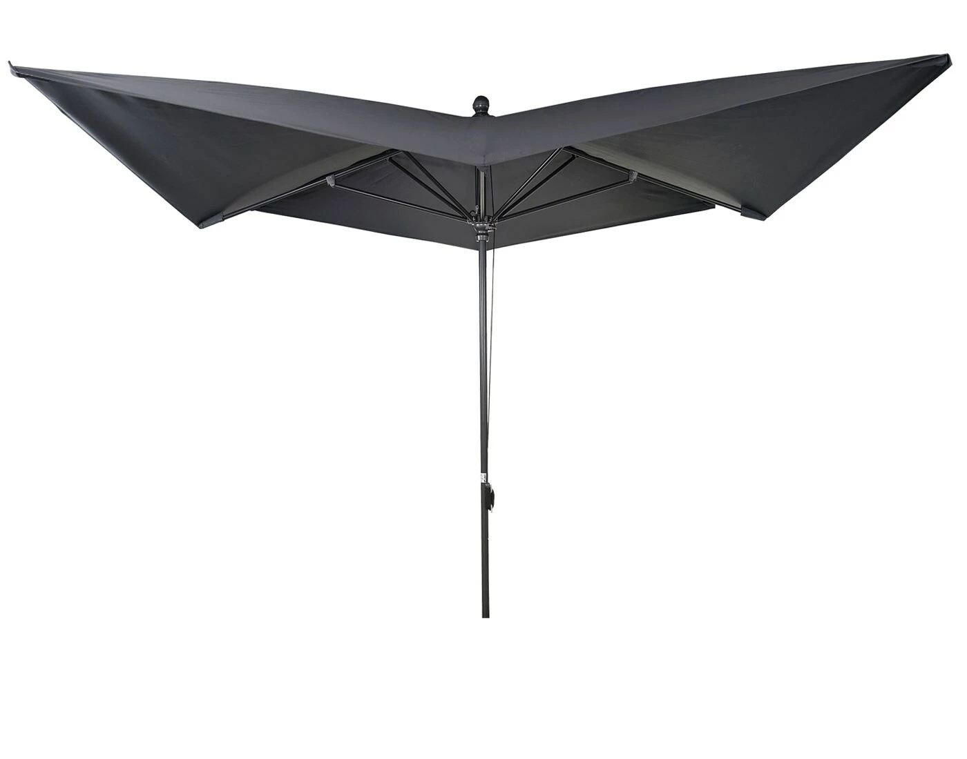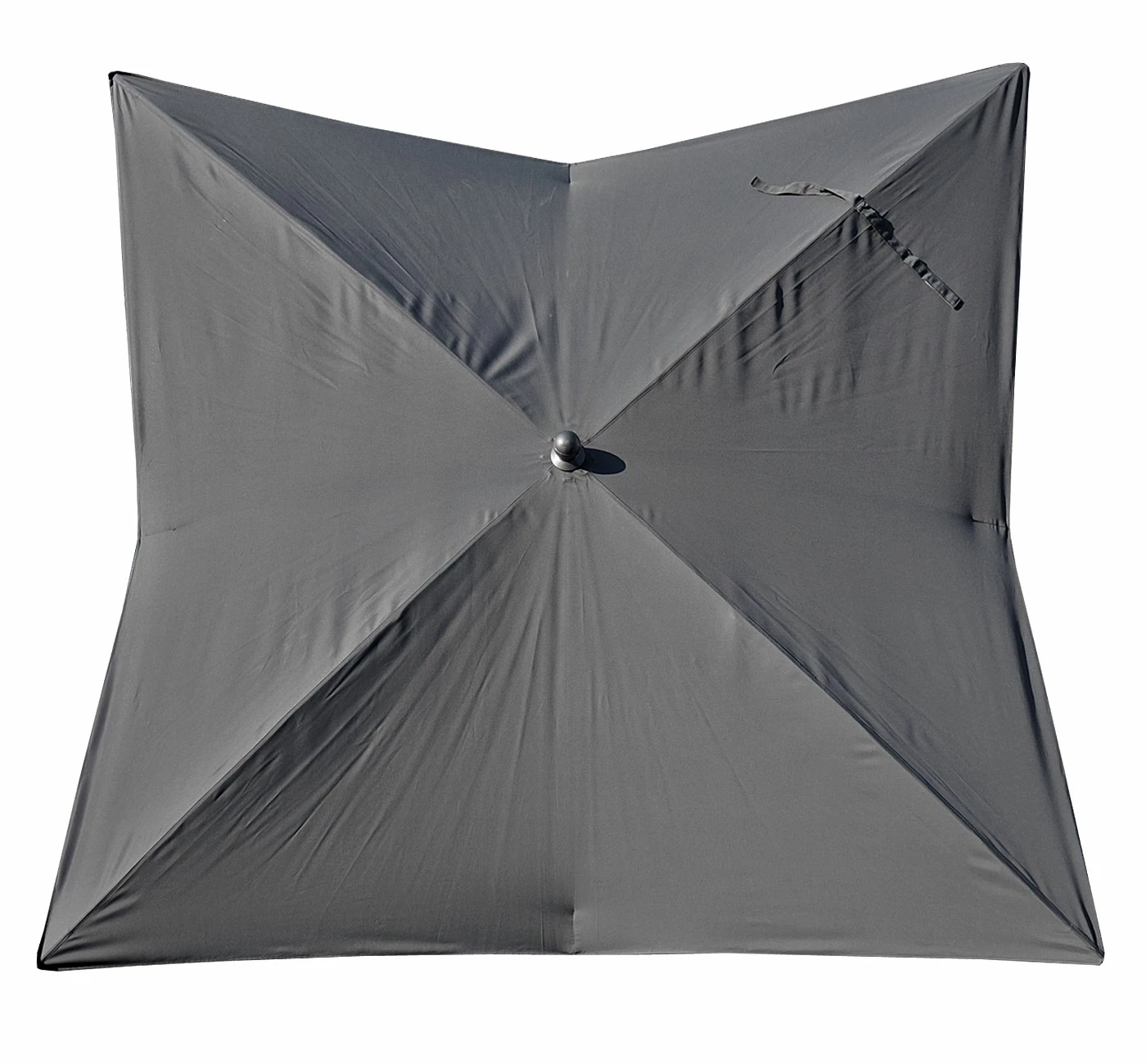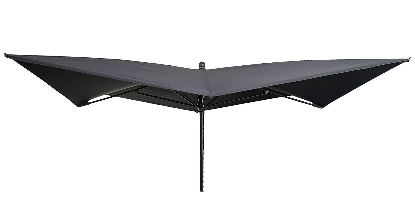 Aufgespannt deckt der Schirm eine rechteckige Fläche von 3x3m ab. Die Spannweite beträgt 4,30m.