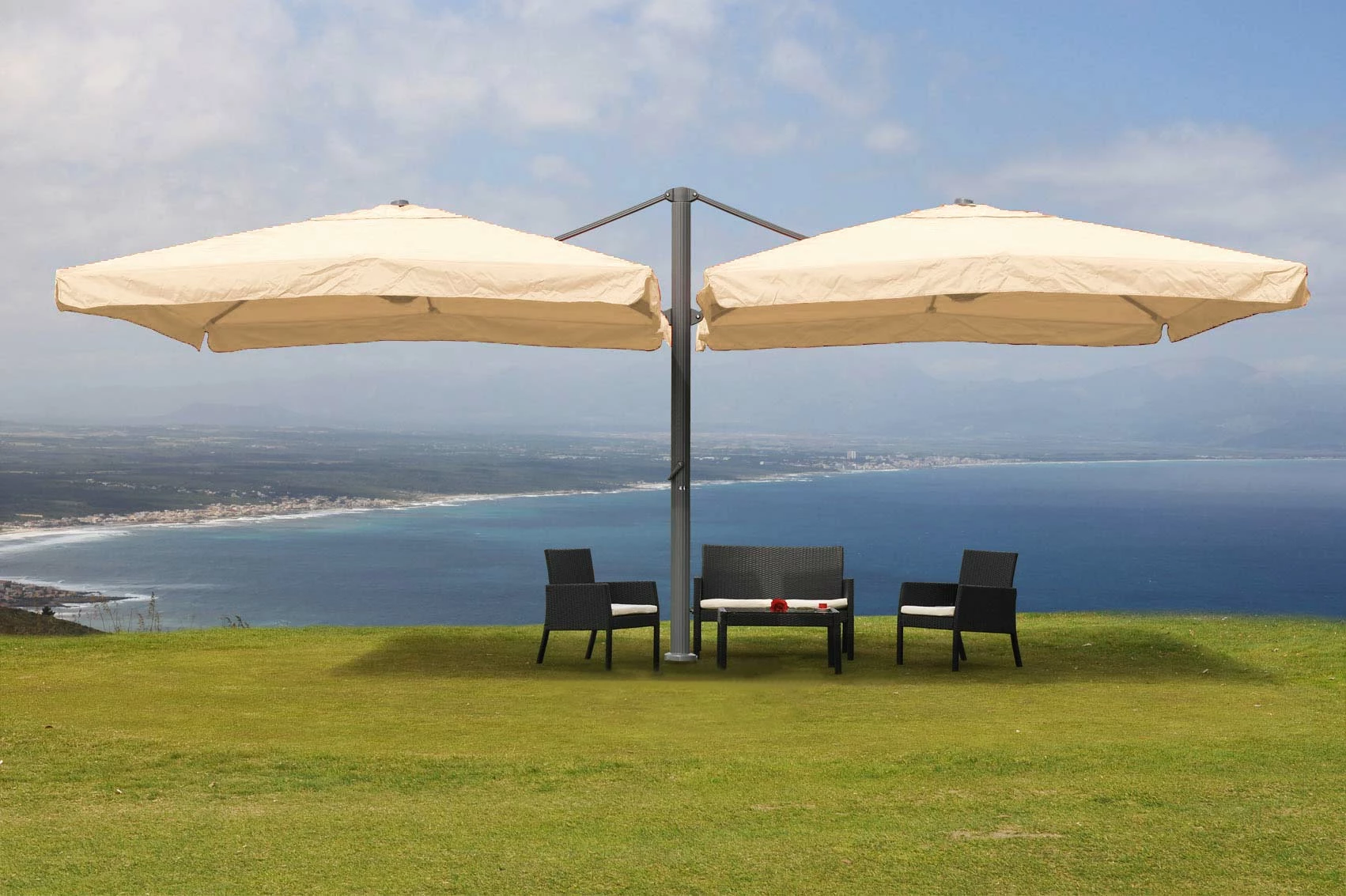 Doppelt hĂ€lt besser – natĂŒrlich ist dieser gigantische Zwillingsschirm, mit seinem GestĂ€nge aus pulverbeschichtetem, rostfreien Aluminium, fĂŒr dauerhafte Aufgaben (bspw. als Pergola oder Gartenlaube) geradezu prĂ€destiniert, andererseits macht ihn der separat oder im Set erhĂ€ltliche SchirmstĂ€nder, dank Rollen und abnehmbarer Deichsel, tatsĂ€chlich mobil. Man möchte beinahe ĂŒber die Mitnahme bei der nĂ€chsten Wanderung nachdenken. SpaĂ beiseite, doch die ungeahnte FlexibilitĂ€t, in Kombination mit bombenfestem Stand, macht unsere SchirmstĂ€nder zum Must-Have – nicht nur fĂŒr gewerbliche Nutzer.