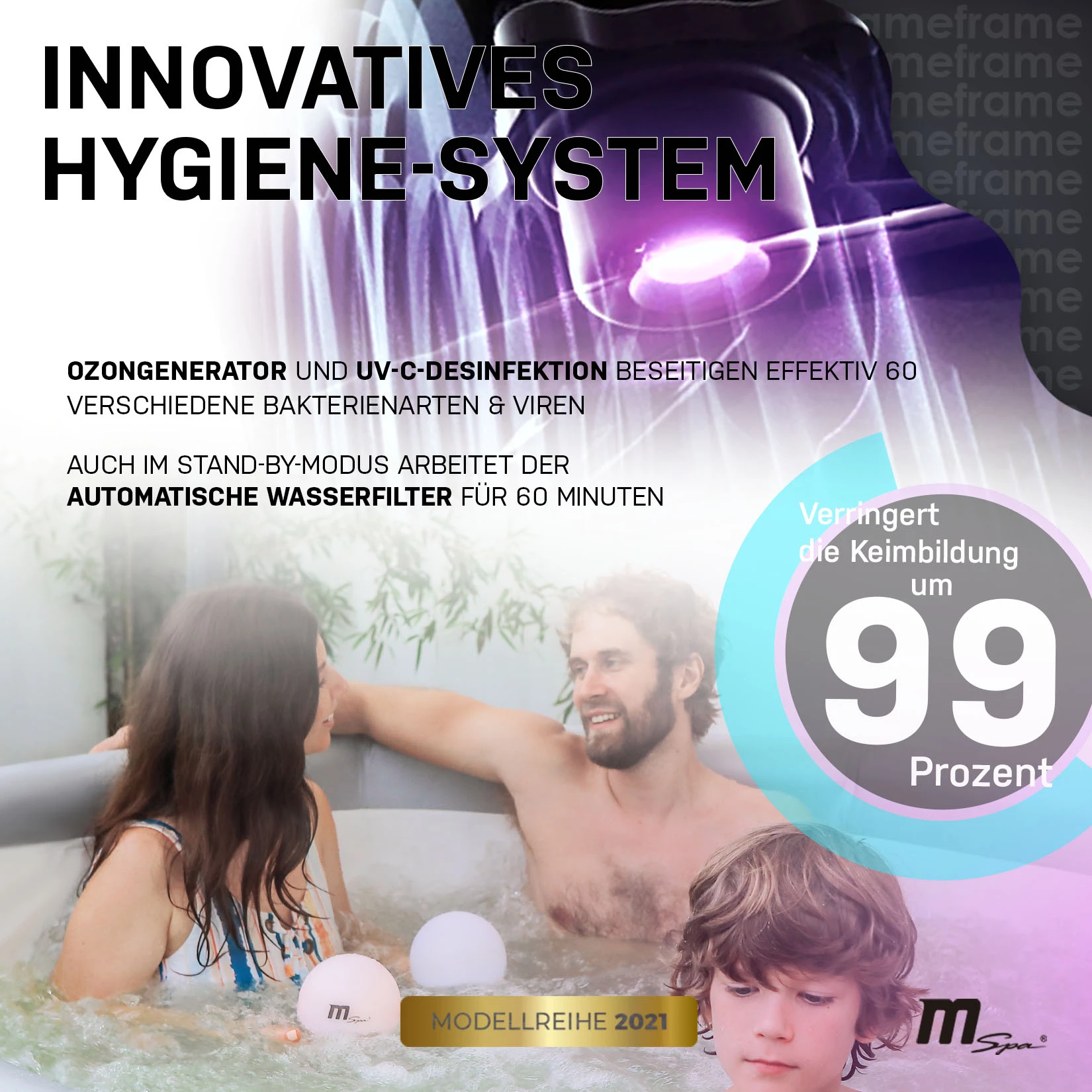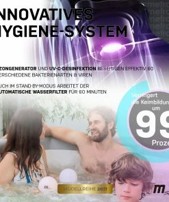 Mit der Kombination aus Ozongenerator & UV-C-Licht besitzt der Miweba MSpa Whirlpool Aurora ein intelligentes Hygienesystem, bei dem sich zwei Technologien optimal ergänzen. Das UV-C-System beseitigt zahlreiche Bakterien im Wasser, das durch den Filter fließt. Es wirkt vor, nach und während des Badens. Der Ozongenerator befreit dagegen den gesamten Whirlpool von Algen und Bakterien. Sie können ihn immer dann einsetzen, wenn sich gerade niemand im Pool befindet. Die Kombitechnologie beseitigt bis zu 60 Bakterienarten und reduziert die Menge benötigter Reinigungsmittel auf ein Minimum.