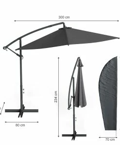 • Die Gesamtmaße betragen beim Sonnenschirm 300 x 300 cm (BxH), bei der Schutzhülle 70 x 265 cm (BxH) und bei dem Ständer 80 x 80 cm (BxT).
