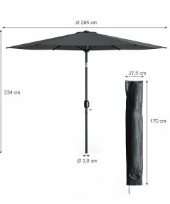 • Die Gesamtmaße betragen beim Sonnenschirm 270 x 234 cm (BxH) und bei der Schutzhülle 27,5 x 170 cm (BxH).