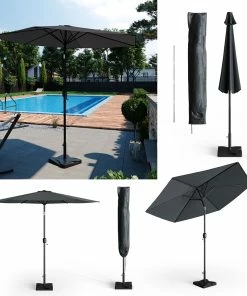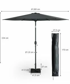 • Die Gesamtmaße betragen beim Sonnenschirm 270 x 234 cm (BxH), bei der Schutzhülle 27,5 x 170 cm (BxH) und bei dem Ständer 41,5 x 37 x 41,5 cm (BxHxT).