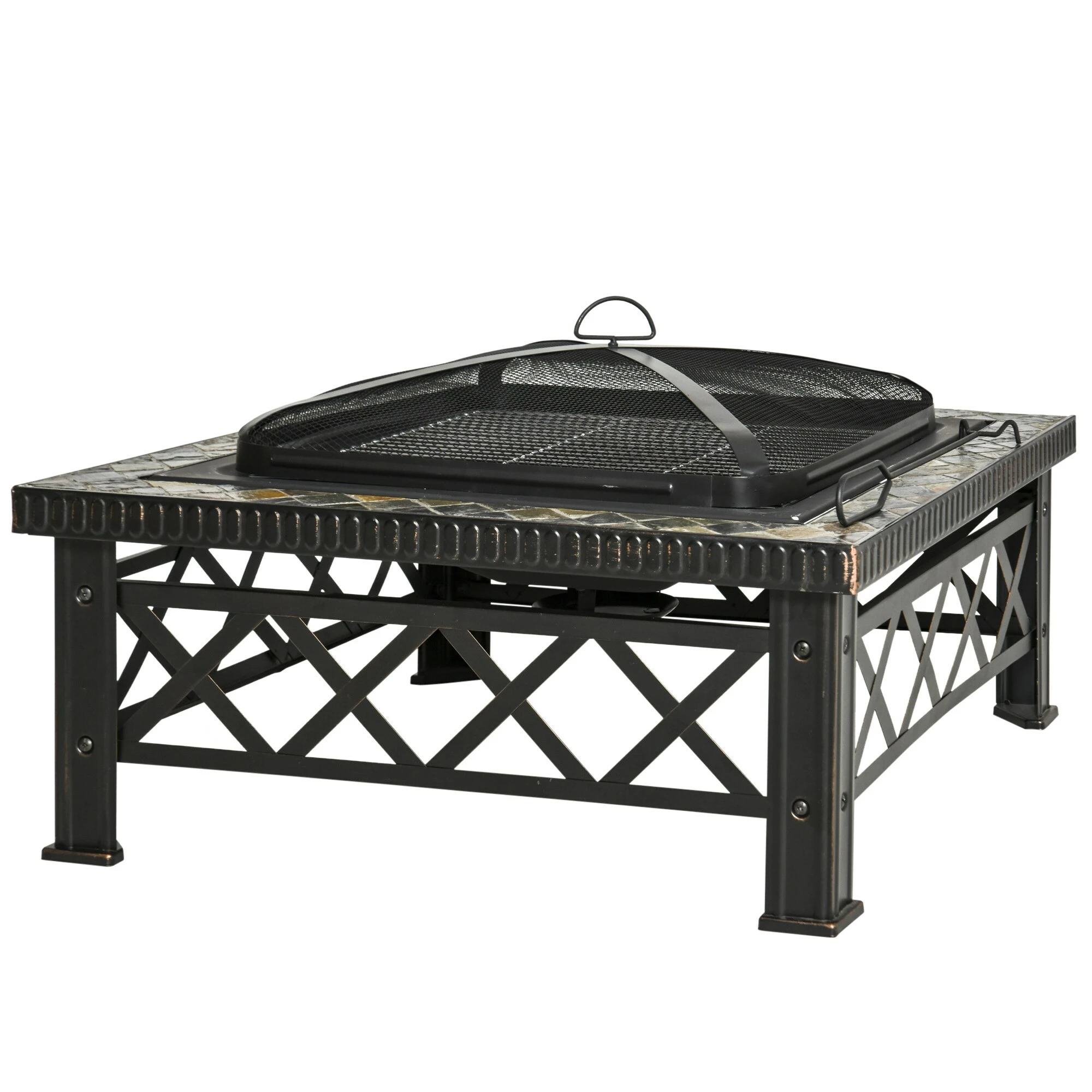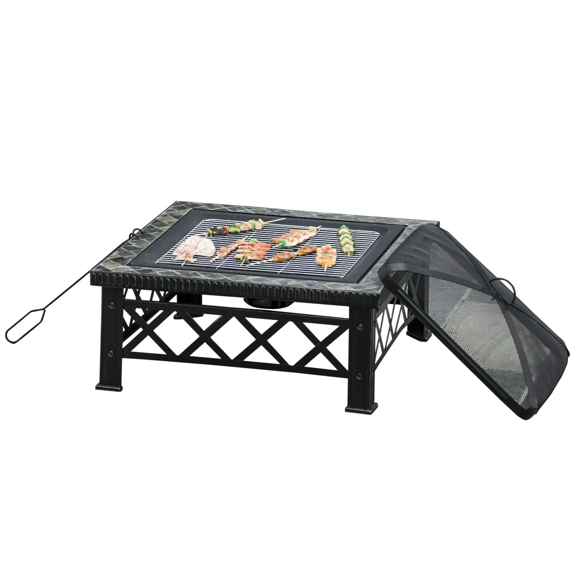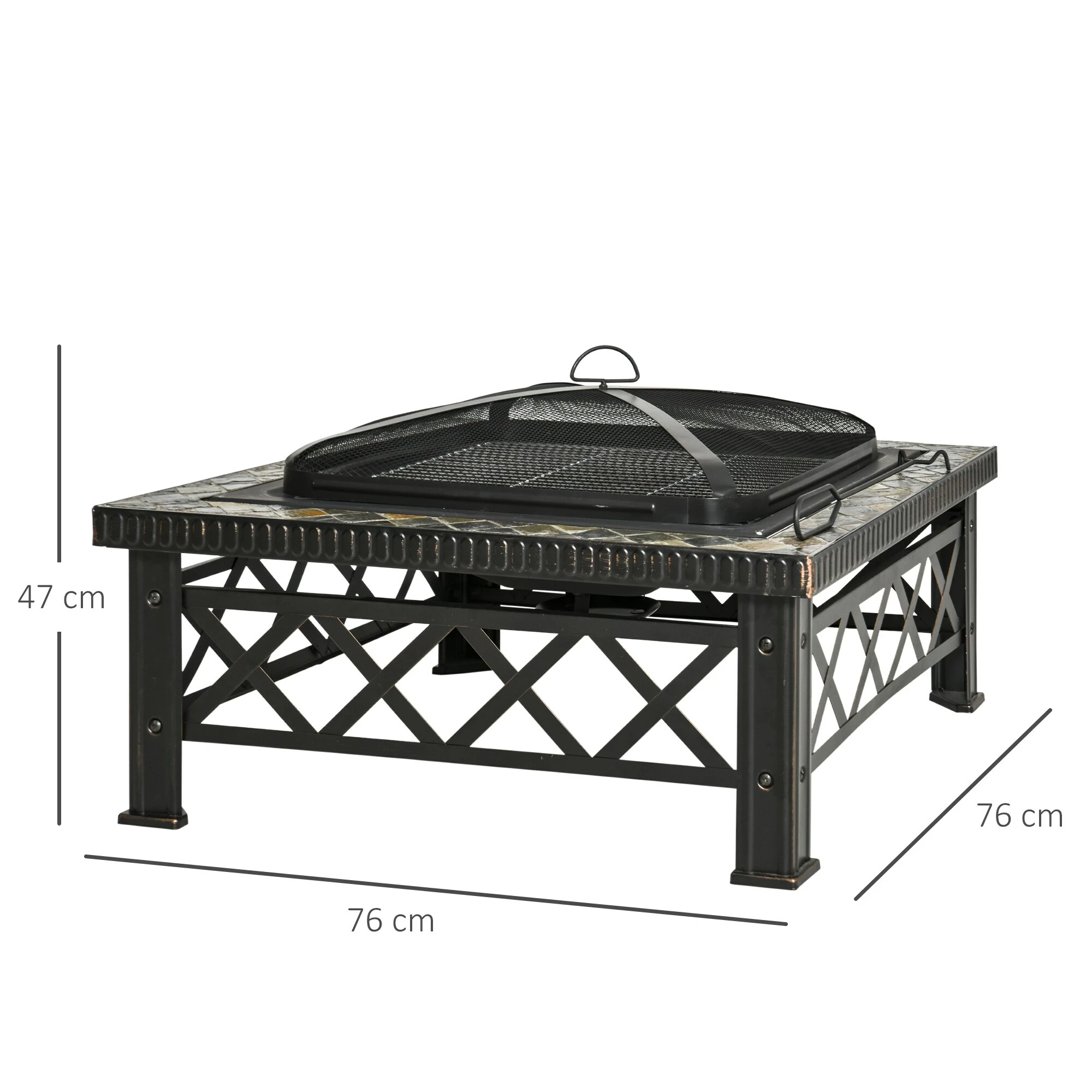 - Maße: Feuerschale: 60,5 x 60,5 cm (LxB), Abdeckung: 53 x 53 x 10 cm (LxBxH), Holzkohlehalter: 33 x 33 cm (LxB), Spieß): 50 x 5 cm (LxB), Grillrost: 50 x 50 cm (LxB)