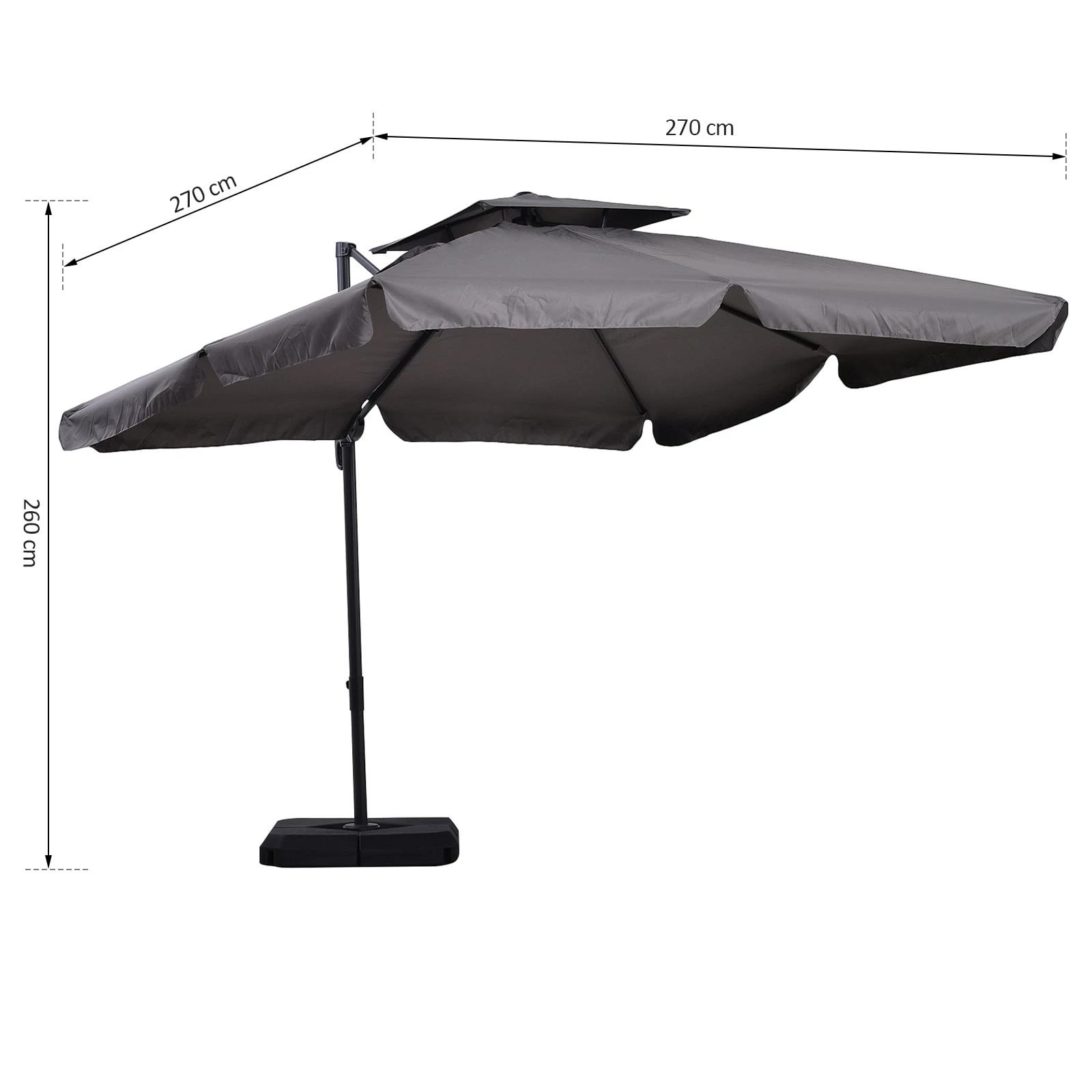 Der Roma Sonnenschirm bietet mehr Schatten für Ihre Außenumgebung, z. B. Gärten, Schwimmbäder, Höfe, Rasenflächen und andere Außenbereiche. Die Oberfläche des Regenschirms besteht aus 100% Polyester, das Wasser- und UV-Beständigkeit bietet. 360° drehbares Design und die 7 Schirmneigungen bietet Ihnen den ganzen Tag vollständigen Schutz vor Sonnenstrahlung.