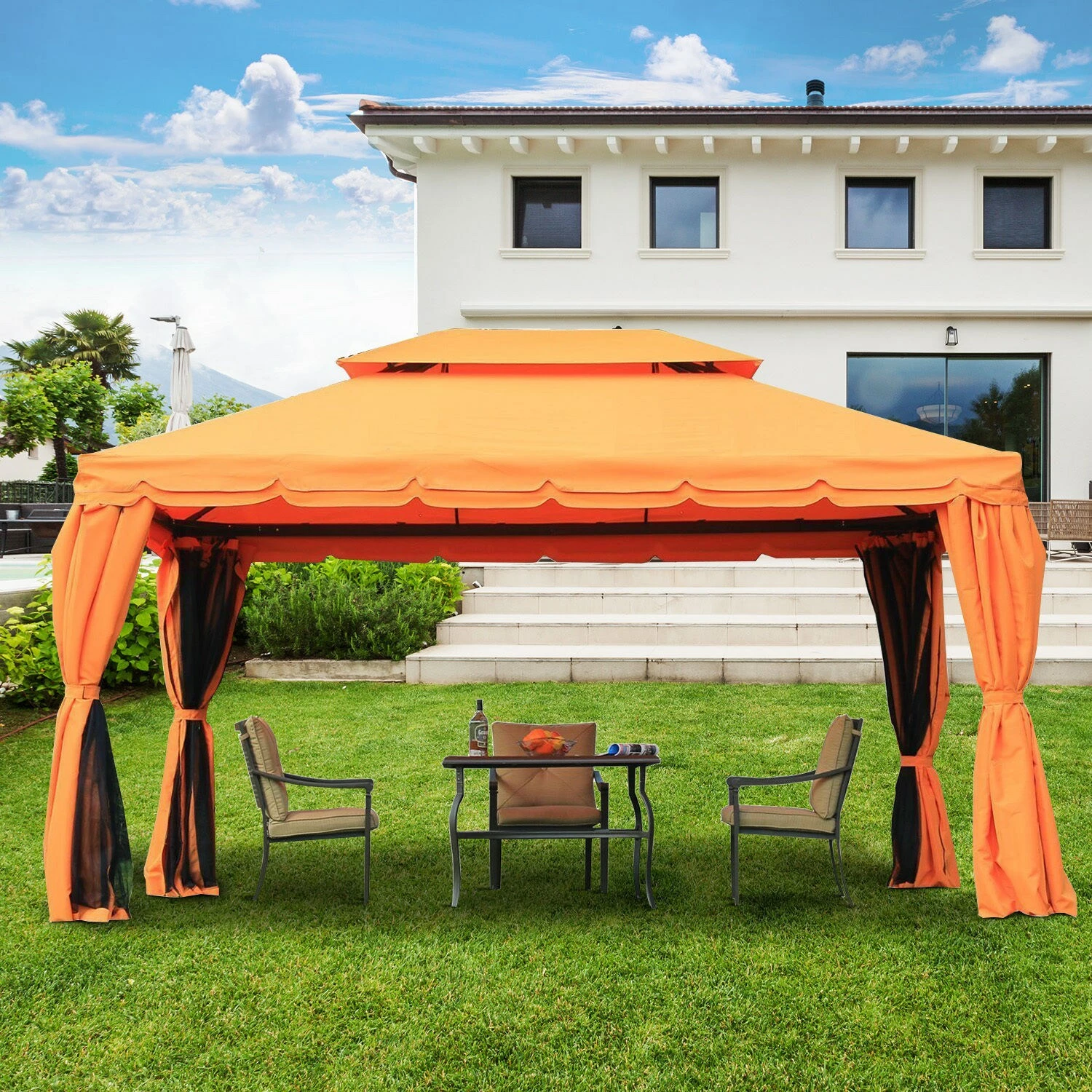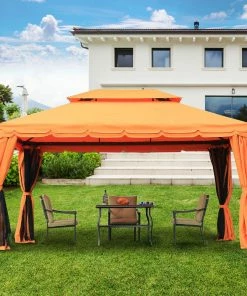 Unser auffälliger Luxus Pavillon ist ein echter Hingucker auf Ihrer Gartenparty. Unkompliziert lässt er sich in Ihrem grünen Wohlfühlparadies aufstellen. Standfestigkeit verleiht ihm ein Grundgestell aus pulverbeschichtetem Aluminium. Das Material überzeugt nicht nur durch Witterungsbeständigkeit, sondern ist auch angenehm leicht. Das Doppeldach ist aus robustem Polyester gefertigt und mit einer PA-Beschichtung versehen. So sind Sie optimal vor intensiver Sonnenstrahlung und Regen geschützt. Regenwasser fließt dabei problemlos über die integrierten Ösen am Dachrand ab.Die Seitenwände bieten Schutz vor Witterungseinflüssen und ist aus wertigem Polyestergewebe hergestellt. Das Moskitonetz wird für die Innenseite genutzt, sodass unerwünschte Insekten draußen bleiben müssen.
