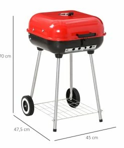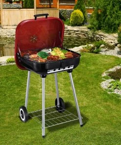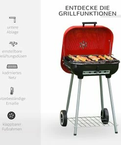 Gerade bei warmen und sommerlichen Temperaturen lockt der Garten zu einem gemütlichen BBQ. Unser Holzkohlegrill besteht aus hitzebeständigem Metall und ist mit einem roten Deckel samt Griff versehen. Auf dem Deckel befindet sich eine verstellbare Belüftungsöffnung, sodass Sie immer optimale Grilltemperaturen im Inneren haben. Damit Sie Ihren Rundgrill auch beim Camping oder gemeinsamen BBQ immer dabei haben, lässt er sich, dank der zwei praktischen Rollen, ganz einfach bewegen. So starten Sie perfekt in die Grillsaison.