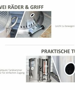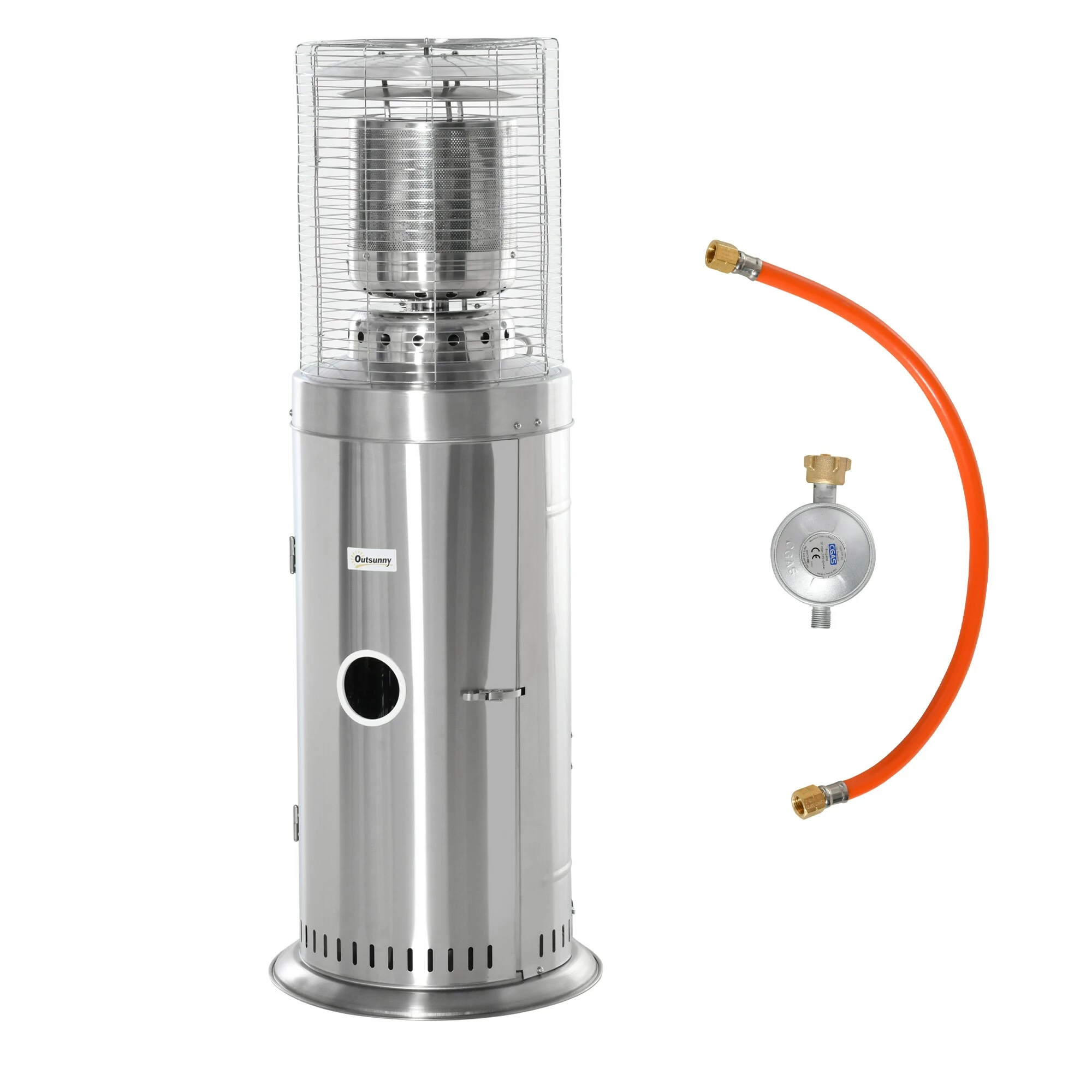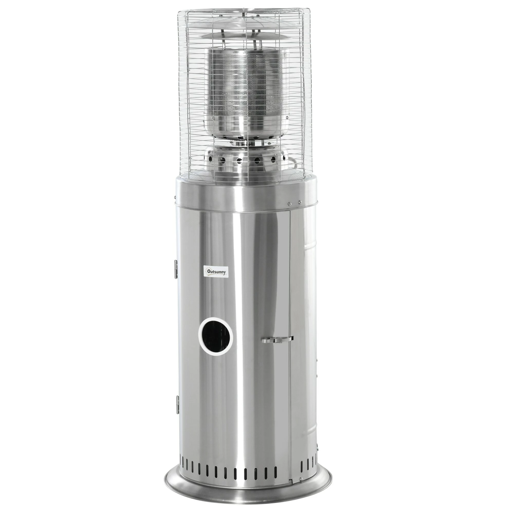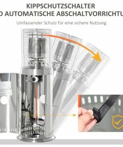 Dieser frei stehende Terrassenheizer von Outsunny wird aus massivem Metall und Edelstahl für Stabilität und Haltbarkeit hergestellt. Die Heizung wird entweder mit Propan, Butan oder Flüssiggas betrieben und kann mit dem Drehknopf zwischen hoch und niedrig eingestellt werden, sodass Sie selbst bestimmen können, wie warm Sie es haben möchten. Zwei Räder sorgen für eine einfache Bewegung, ein Kippschutz und eine automatische Sicherheitsabschaltung für eine sichere Nutzung.