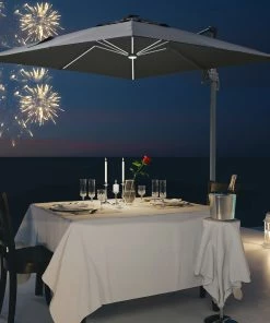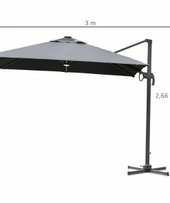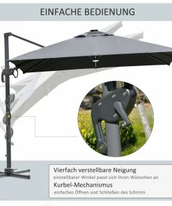 Unser großer Cantilever-Sonnenschirm bietet Ihnen den besten Schatten für sonnige Tage. Das Schirmdach aus Polyester bietet Schutz vor direkter Sonneneinstrahlung und Hitze. Mit einem Kurbelmechanismus für müheloses Öffnen und Schließen kann das Schirmdach um volle 360 Grad gedreht werden, damit Sie den ganzen Tag lang geschützt sind. Angetrieben durch ein Solarpanel, können die LED-Leuchten an den Rippen Ihnen mehr Licht in der Nacht bieten.