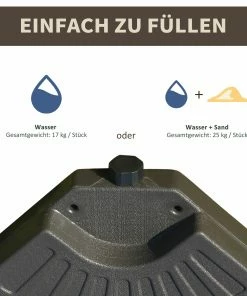 Sie müssen sich keine Sorgen machen, dass der Wind Ihre Sommerentspannung im Schatten stören könnte, mit diesem 4-teiligen Schirmgewichtsfuß. Dieses 4-teilige Set ist aus haltbarem HDPE-Material gefertigt, witterungsbeständig und pflegeleicht. Alles, was Sie brauchen, ist, den Sockel mit Wasser oder einer Mischung aus Sand und Wasser zu füllen, und dann wird der Sockel den Schirm sicher und gleichmäßig in Ihrem Garten oder auf der Terrasse halten.