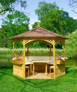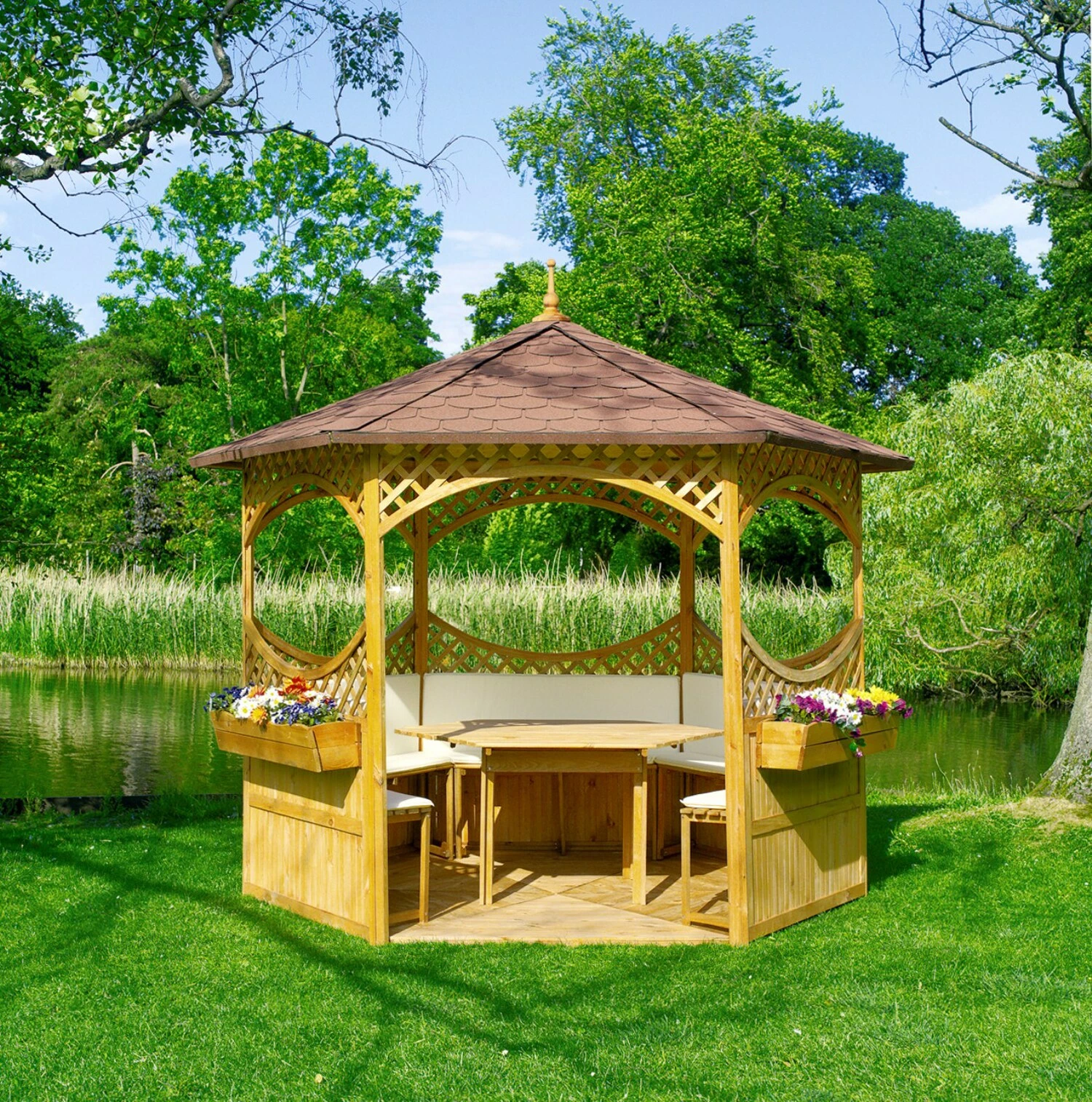 Exklusiver Pavillon mit Dach aus Bitumenschindeln. Die oberen Rundbögen aus Leimholz und die Möbel sind im Lieferumfang enthalten.Als Zubehör können Blumenkästen, ein Holzboden und ein Wetterschutzumhang separat erworben werden. Diese Pavillon-Serie gibt es alternativ auch mit einem schickem Dach aus Holz,einem Holzdach mit Dachpappe oder grüner Dachfolie (PE-Folie).
