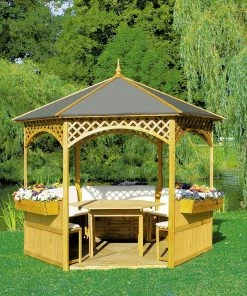 Exklusiver Pavillon mit Dach aus Holzkonstruktion und Dachpappe. Die oberen Rundbögen aus Leimholz und die Möbel sind im Lieferumfang enthalten. Als Zubehör können Blumenkästen, ein Holzboden und ein Wetterschutzumhang separat erworben werden. Diese Pavillon-Serie gibt es alternativ auch mit einem schickem Dach aus Holz, Bitumenschindeln oder grüner Dachfolie (PE-Folie).