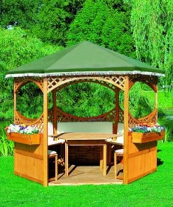 Exklusiver Pavillon mit Dach aus stabilem grünen PE-Gewebe. Die oberen Rundbögen aus Leimholz und die Möbel sind im Lieferumfang enthalten. Als Zubehör können Blumenkästen, ein Holzboden und ein Wetterschutzumhang separat erworben werden. Diese Pavillon-Serie gibt es alternativ auch mit einem schickem Dach aus Holz, Bitumenschindeln oder einer Holzkonstruktion mit Dachpappe.