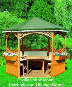 Exclusiver Pavillon mit Dach aus stabilem grünem PE-Gewebe. Die oberen Rundbögen aus Leimholz sind im Lieferumfang enthalten. Als Zubehör sind Möbel, Blumenkästen, ein Holzboden, die unteren Rundbögen und ein Wetterschutzumhang separat erhältlich.