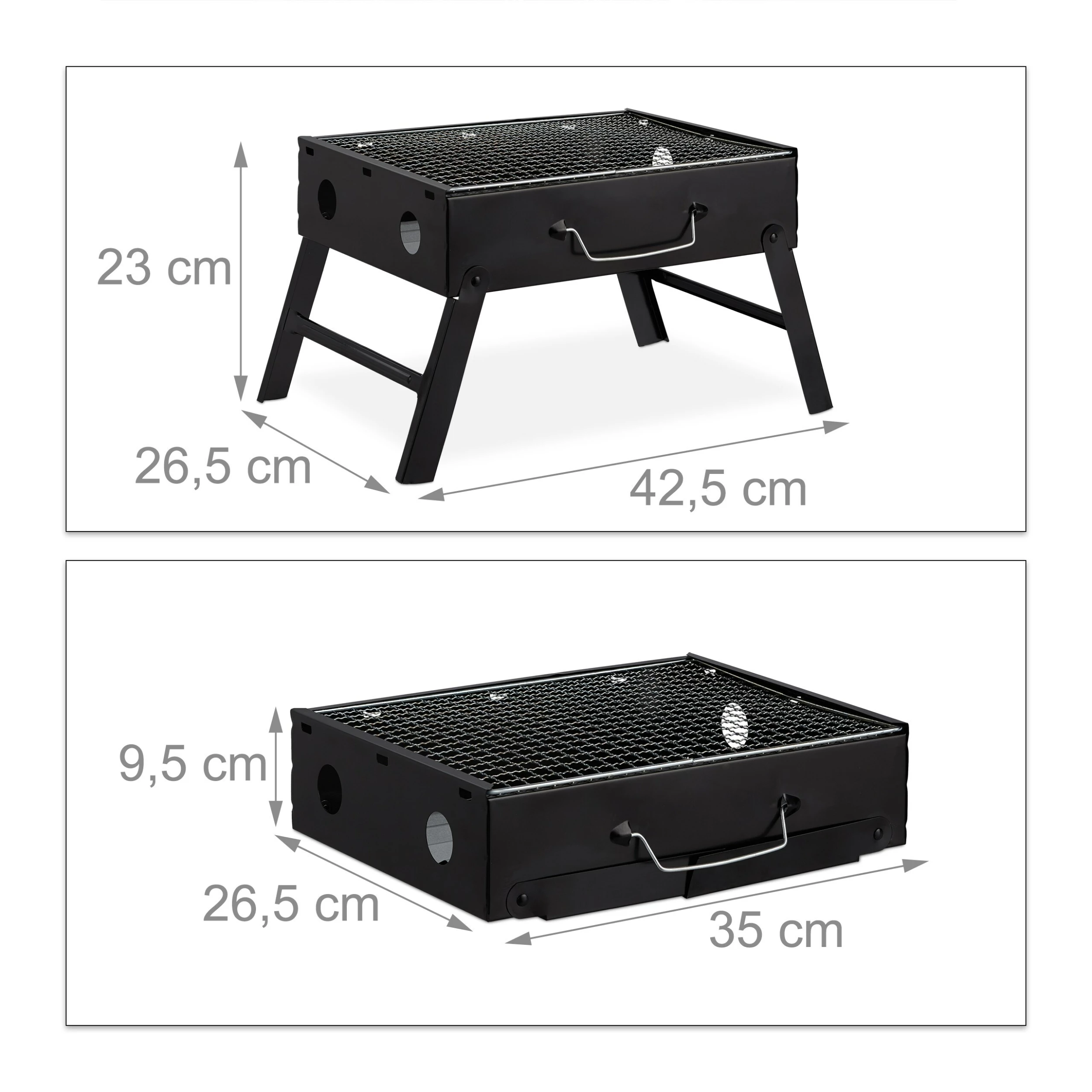 Was gibt es Schöneres als an einem sonnigen Tag mit Freunden im Park zu grillen? Mit dem kompakten Camping Koffergrill mit Tragegriff steht einem spontanen Picknick nichts mehr im Weg. Der faltbare Campinggrill ist fix aufgebaut. Dafür müssen lediglich die Beine ausgeklappt werden. Die Kohlewanne bringt dank Lüftungslöchern die Kohle schnell zum Glühen. Der Gitter-Grillrost aus Edelstahl fasst Grillgut für 4 Personen.