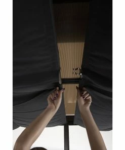 Zum Schutz vor Sonne ist der Pavillon mit einem Raffdach ausgestattet welches mittels Handgriffs beliebig gespannt werden kann.