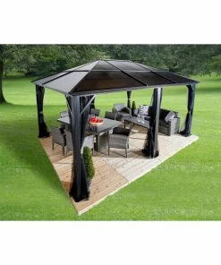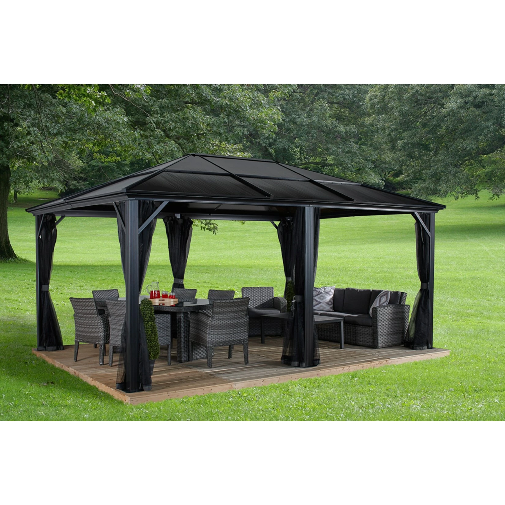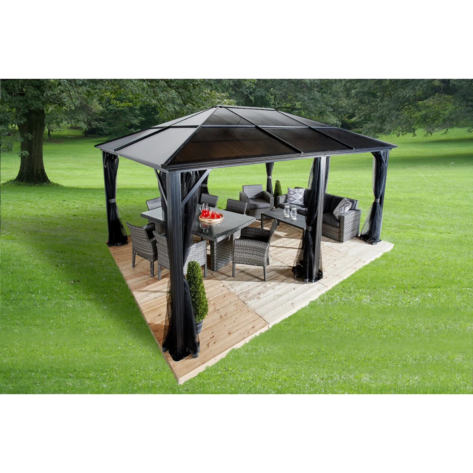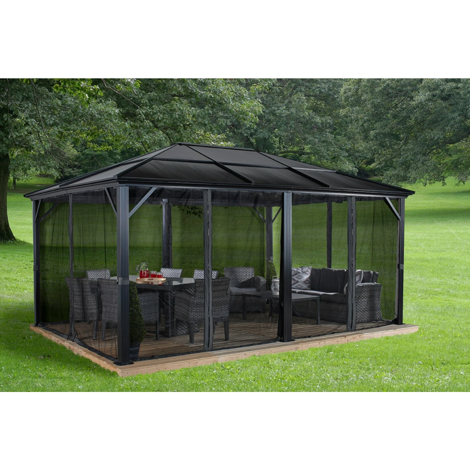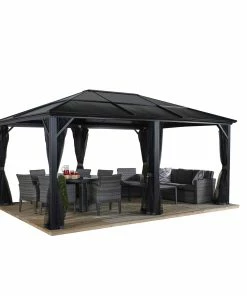 Der Pavillon Meridien kommt in edlen Anthrazit Farbton. Optisch passende Vorhänge (Dunkelgrau) separat erhältlich.