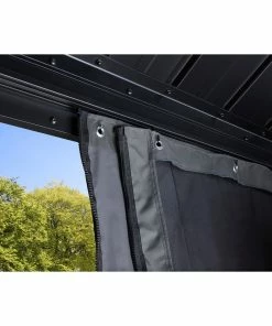 Inklusive Moskitonetzen aus beschichtetem PVC (Mesh) und zweigleisigen Laufschienen zur zusätzlichen Anbringung von Vorhängen.