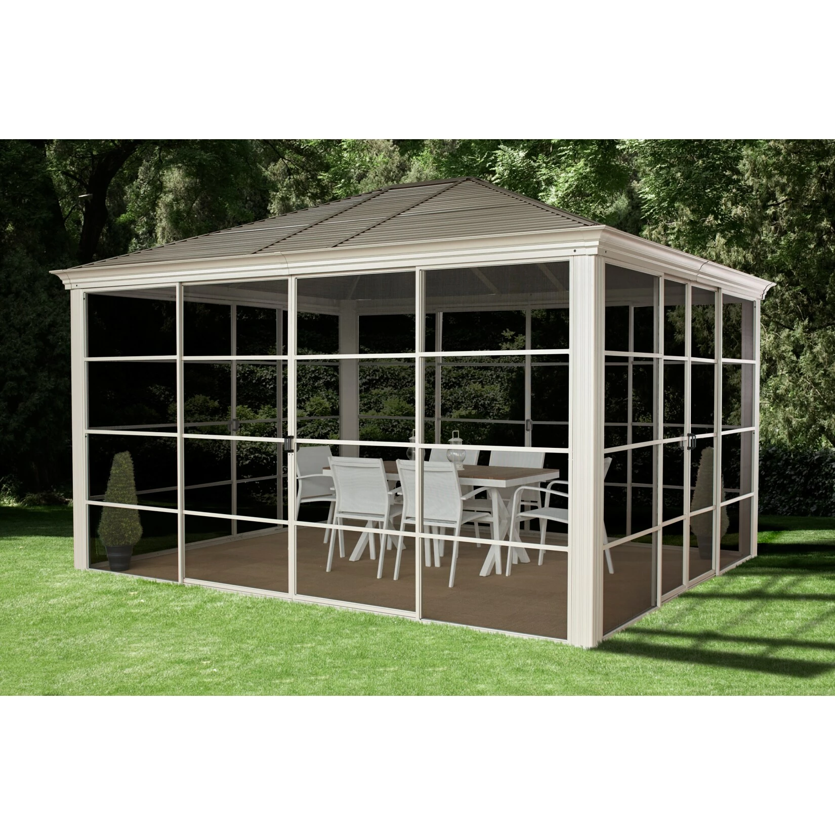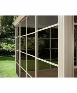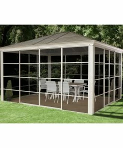 Das gleiche gilt für die massive Konstruktion aus resistentem, pulverbeschichtetem Aluminium (Pfostenstärke 7,6 cm). Selbst die Schrauben bestehen aus rostfreiem Edelstahl. Der Pavillon muss daher im Winter nicht abgebaut werden.