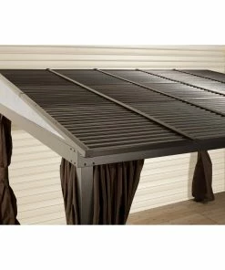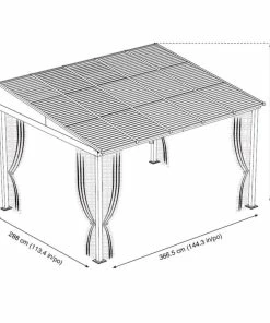 Befestigungsclips sind im Lieferumfang vorhanden. Die Terrassenüberdachung kommt in edlem Anthrazit Farbton. Optisch passende Vorhänge (Grau) werden mitgeliefert.