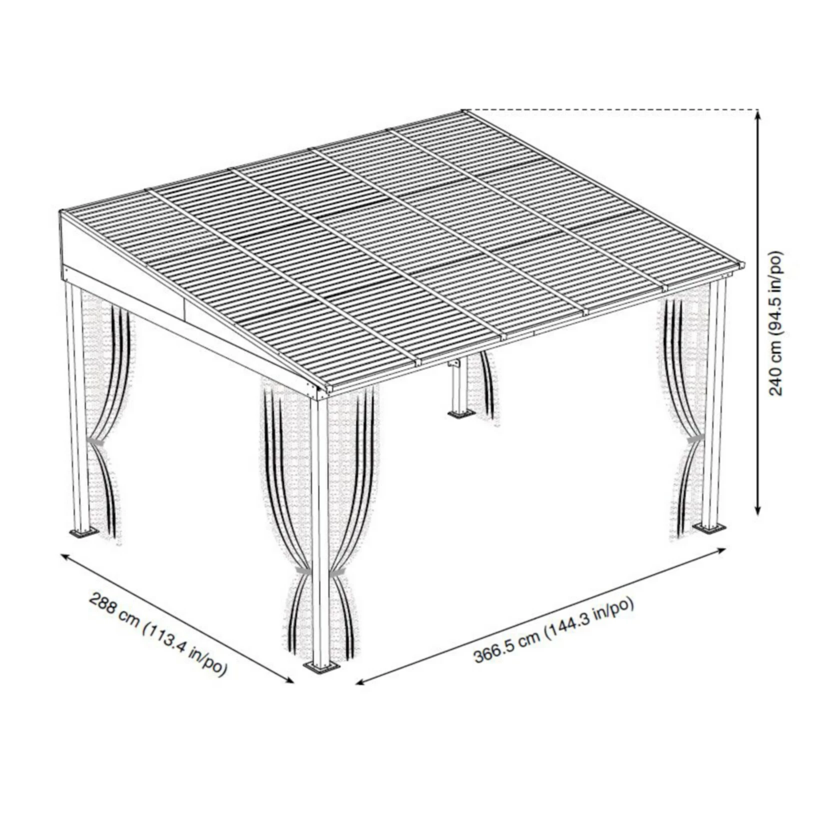 Die Terrassenüberdachung kann somit das ganze Jahr stehen bleiben und muss im Winter nicht abgebaut werden. Die mitgelieferten Schneelaststützen geben Ihrer Überdachung zusätzlichen Halt. Inklusive Moskitonetzen aus Nylon und Vorhängen aus 180g/m² Polyester, welche dank zweigleisigem Laufschienensystem zusammen angebracht werden können.