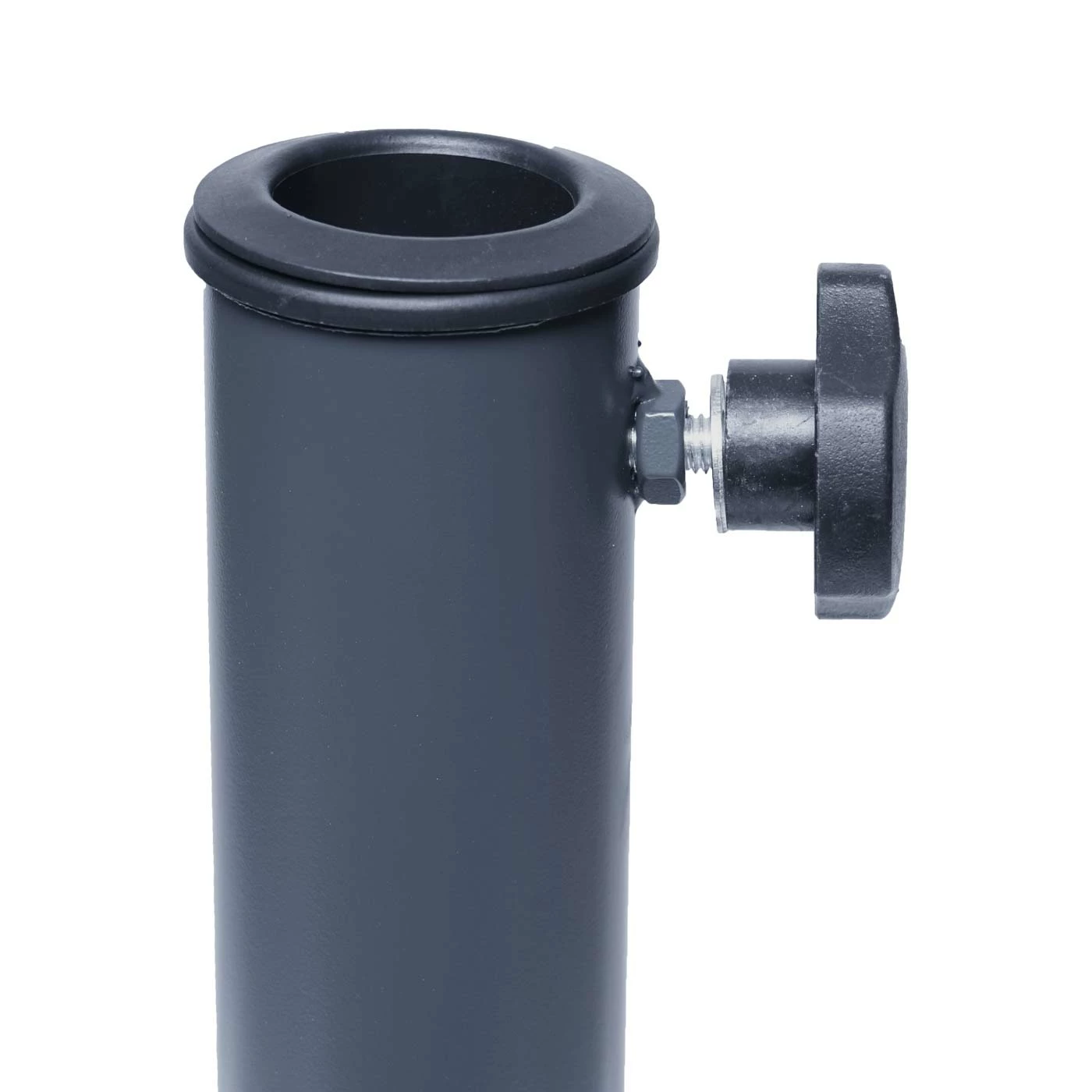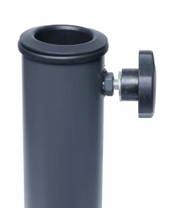 – Durch eine Feststellschraube an der Außenseite kann der Schirmstamm eingespannt und fixiert werden. Dieser Schirmständer sorgt für eine bessere Standfestigkeit auf Bodenhülsen.