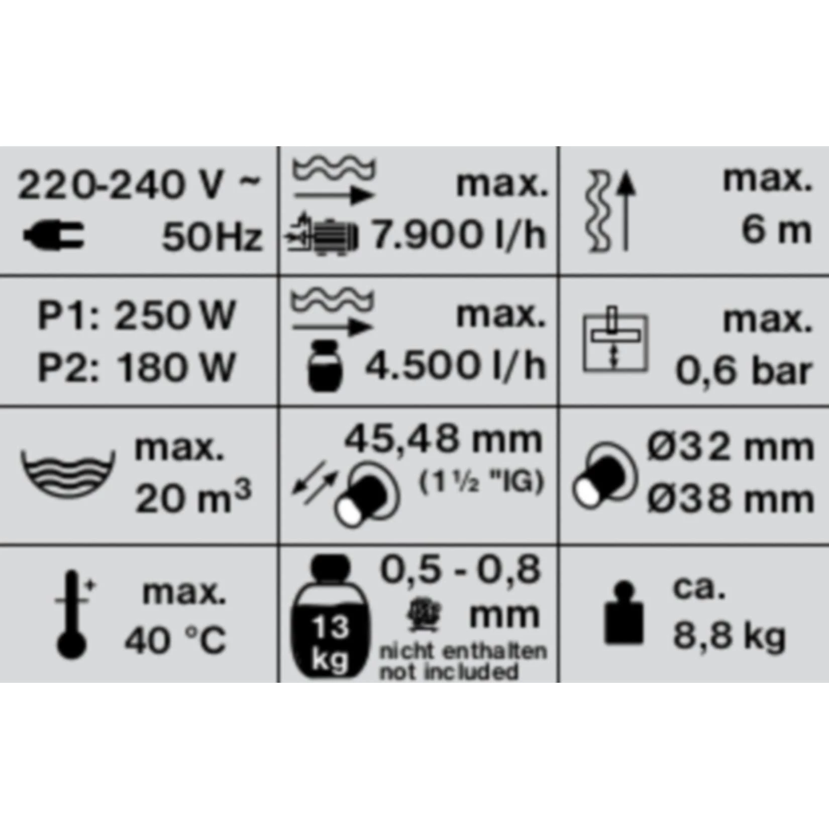 - Fördermenge Pumpe max.: 7.900 l/h , 7,9 m³/h