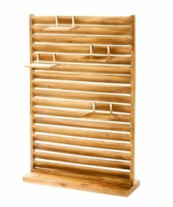 - Freistehend und mit vier kleinen Ablageflächen, die einfach an die Holzlatten gehängt werden