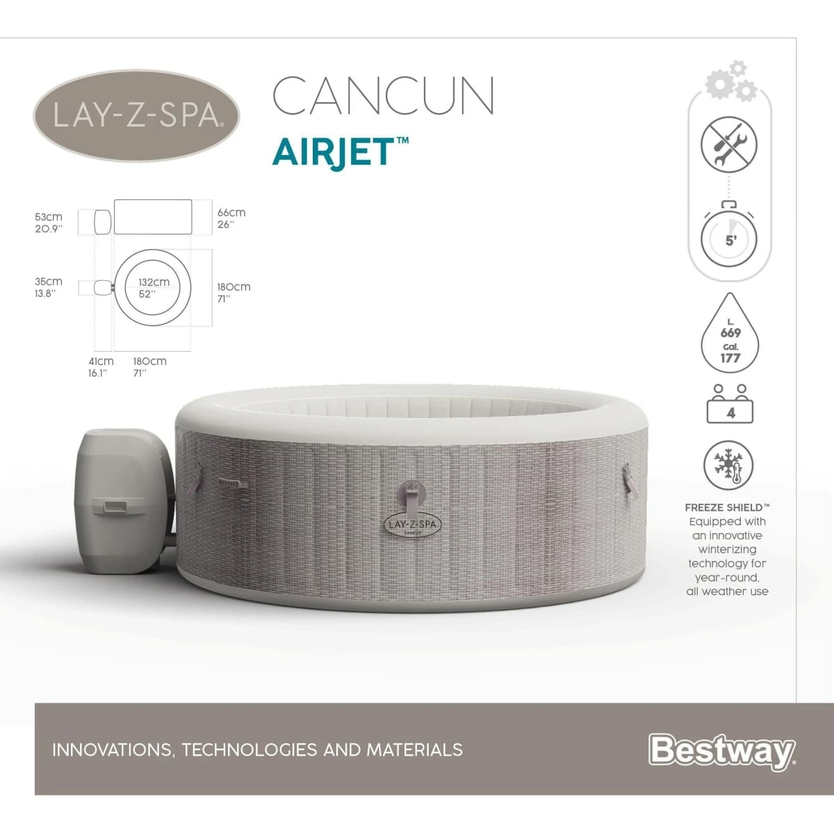 - Maße: Größe aufgeblasen ca. Ø180 x H66 cm, Innenmaß ca. Ø 132 cm, Wasserkapazität ca. 669 l , Füllgewicht ca. 696 kg