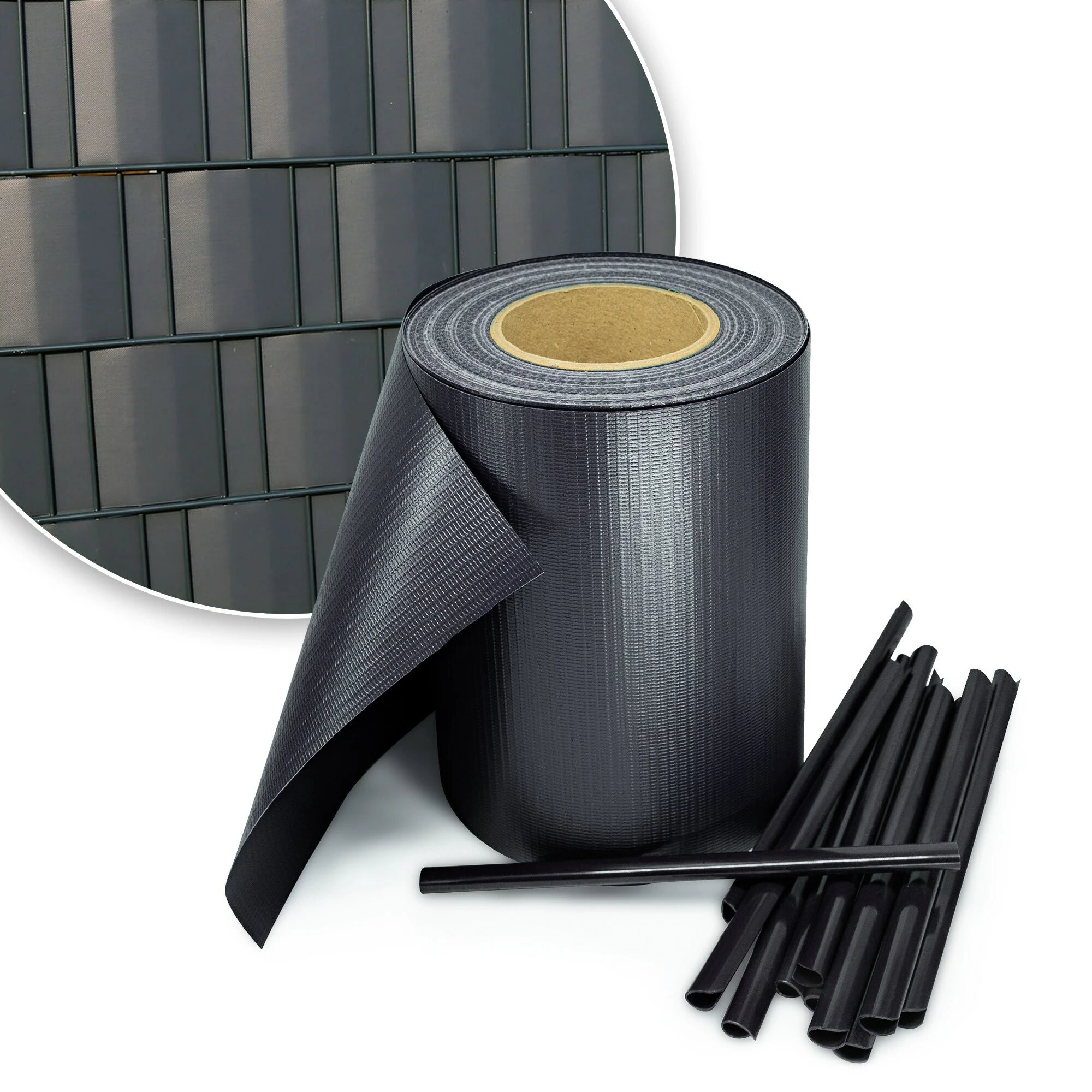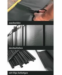 Die Streifen befinden sich auf jeweils einer 35 m Rolle, sodass sie individuell zugeschnitten werden können. Das Anbringen erfolgt kinderleicht, einfach einfädeln und mit Hilfe der mitgelieferten Clips einklemmen.