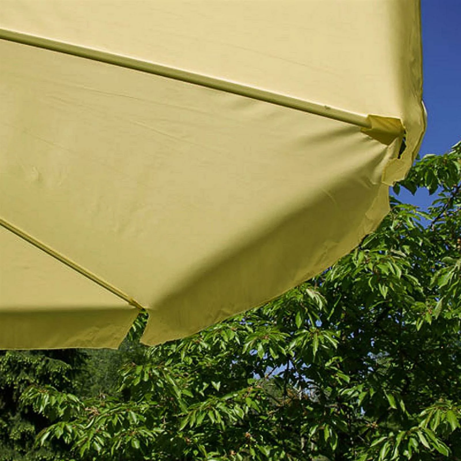Wunderschöner achteckiger Sonnenschirm mit 8 Rippen und einem Schirmdurchmesser von 3,80m, also fast 4m. Die Bespannung mit Volant ist aus Polyester (160 g/m²).
