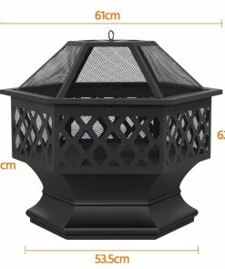 Mit dieser metallenen sechseckigen Feuerschale aus Metall werden Sie im Spätherbst oder im kalten Winter, durch ein schönes Feuer, mit Wärme versorgt. Diese sechseckige Feuerstelle ist mit einer seitlichen Gitterabdeckung versehen, die die Luft- und Wärmezirkulation verbessert und so einen größeren Bereich mit Wärme versorgen kann.